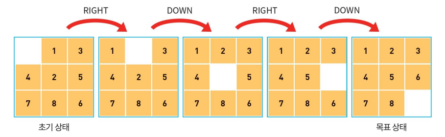 초기 상태에서 목표 상태를 발견하는 것만이 아니라, 경로(right, down, right, down)도 또한 탐색하게 된다.