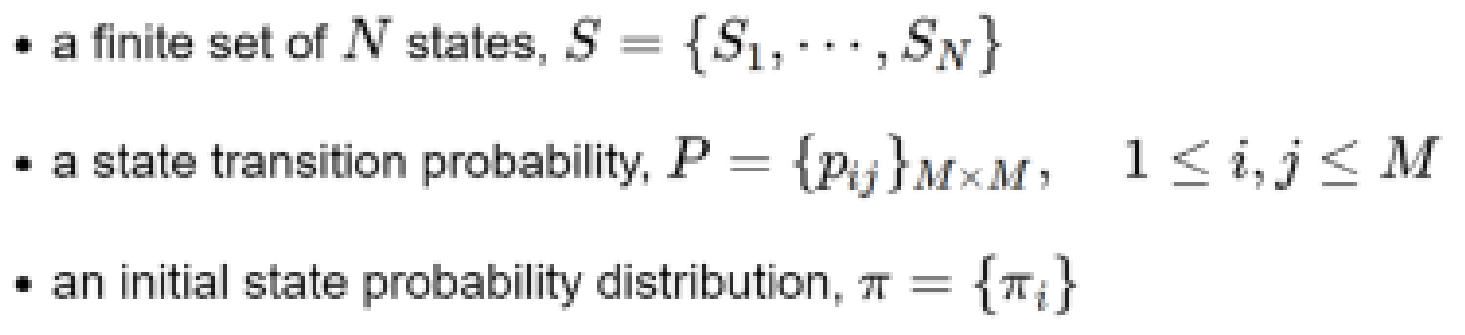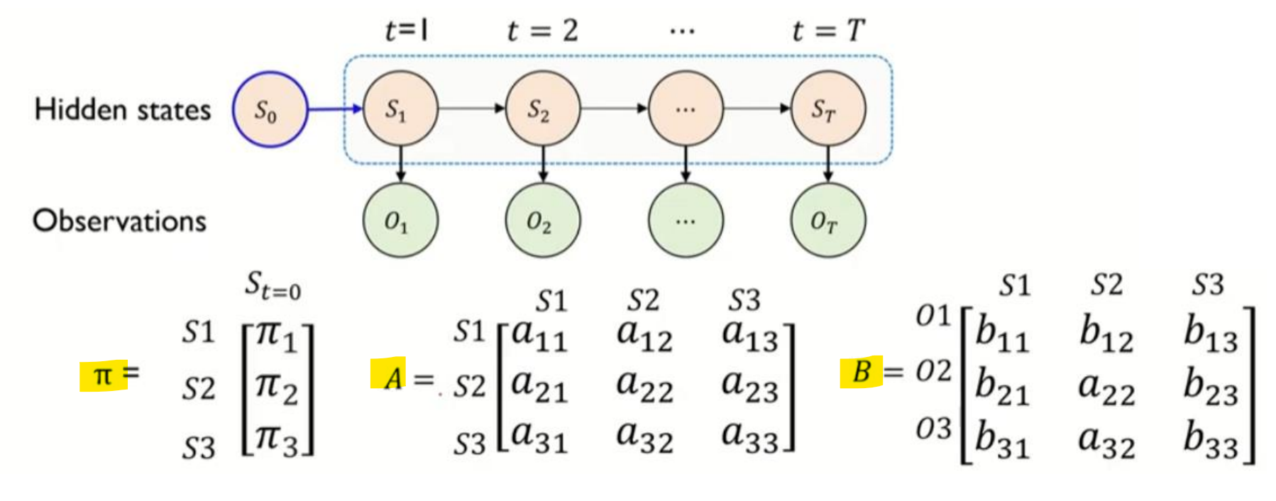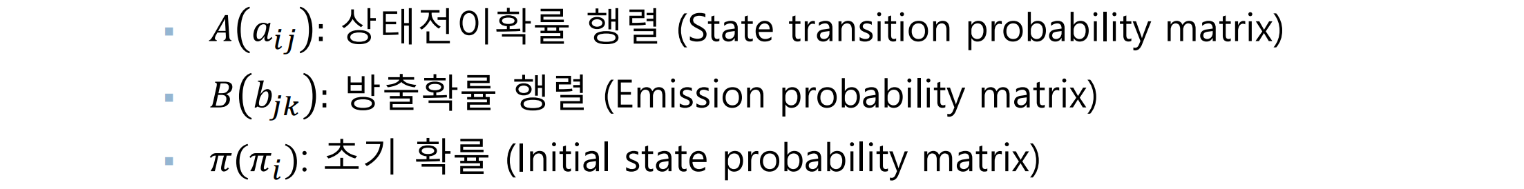 초기 상태 확률 (Initial State Probability), 𝝅 : HMM을 가동시킬 때 어느 상태에서 시작할 지 결정 (제일 처음에 어디서부터 시작하는지)