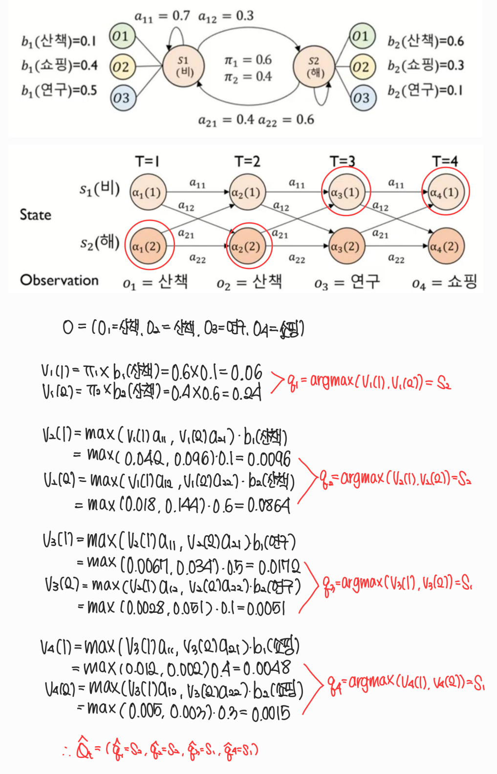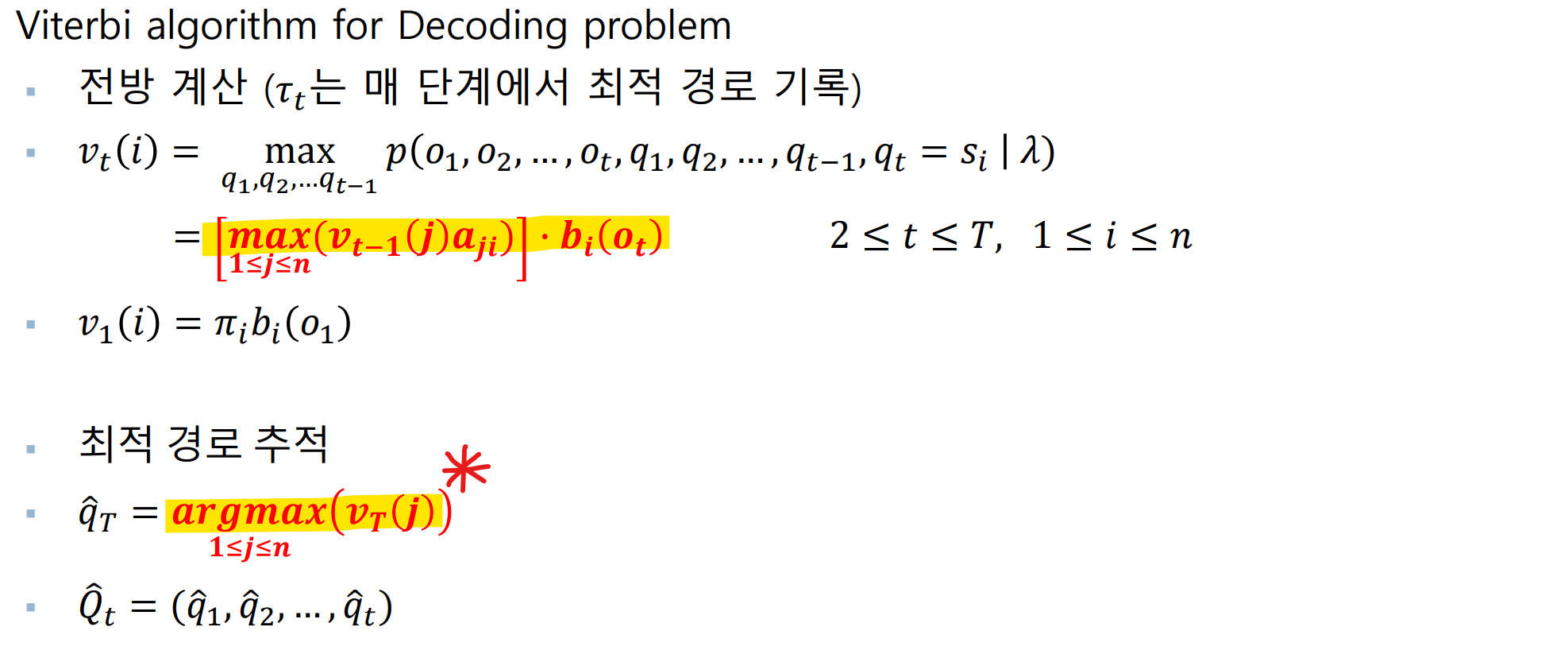 - Decoding problem: HMM(𝜆∗)과 O가 주어졌을 때 hidden state sequence를 찾는 문제