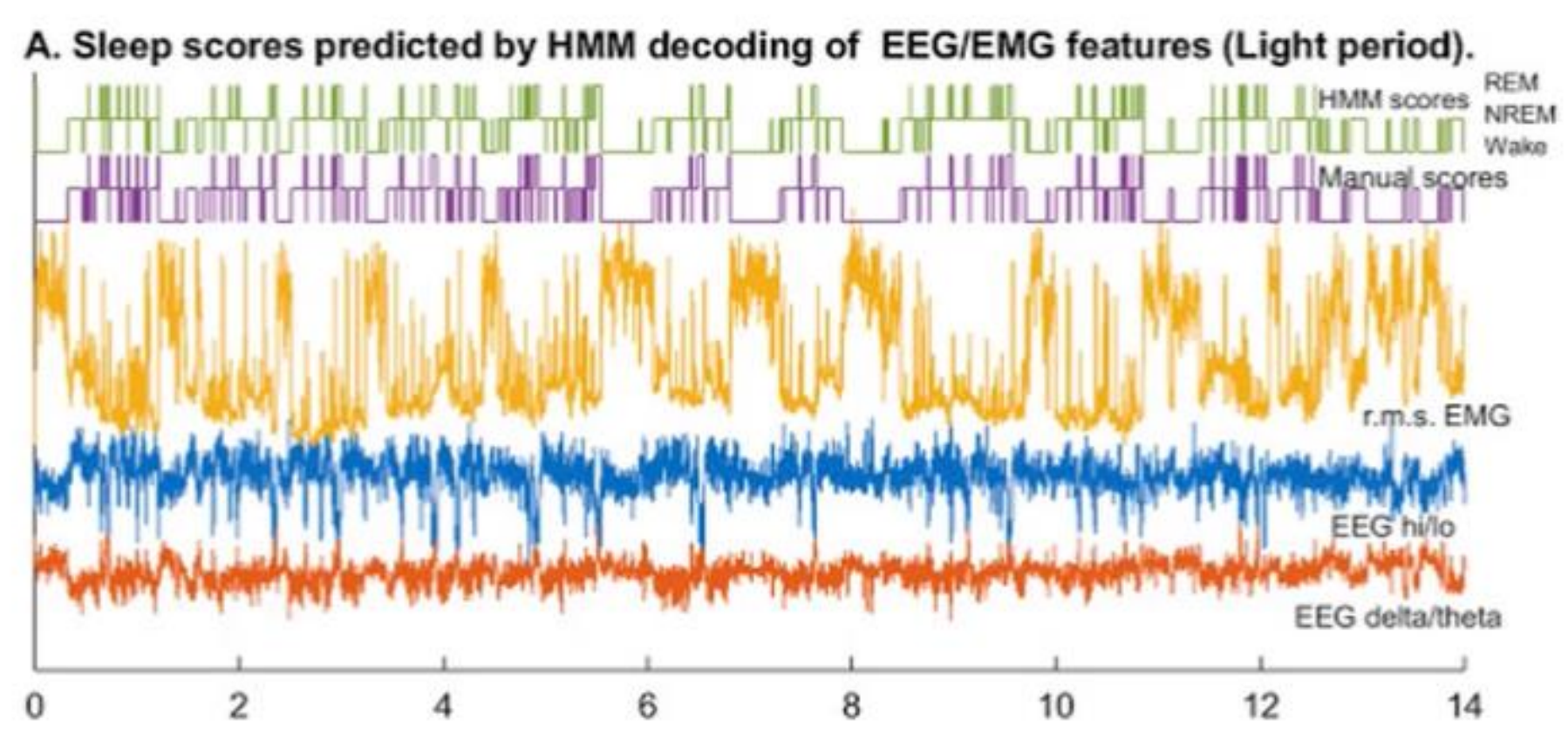 관측 시퀀스 : 수면 EEG 데이터 / 은닉 시퀀스 : REM-수면, NREM-수면, wake