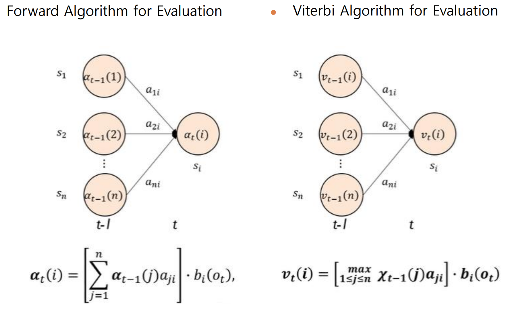 - Forward Algorithm for Evaluation : 가능한 모든 경우의 확률 합 (Observable state의 확률을 구하는 것이 목표)