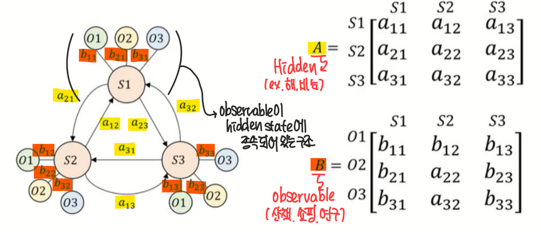 방출 확률 (Emission probability), 𝑩 : HMM이 어느 상태에 도달했을 때, 그 상태에서 관측될 확률 결정