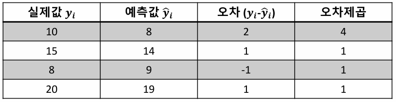 예측한 값과 실제 값의 차이를 제곱하여 평균내는 방식
