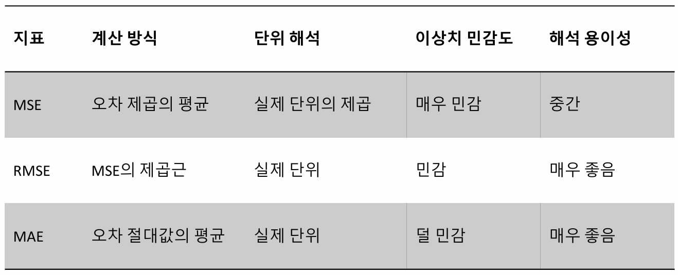 RMSE : 큰 오차에 집중하면서 안정적인 분석 필요한 경우