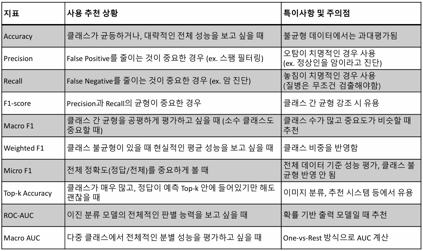 - 클래스 불균형에 강건한 평가 가능