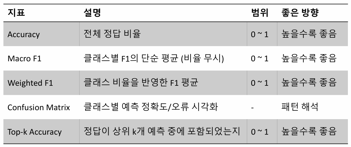 F1 Score로 전체 클래스의 성능을 균등하게 평가할 때 사용