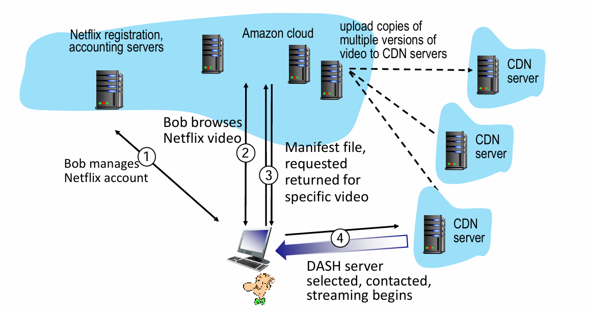 4) Bob이 manifest를 보고 최적의 CDN 서버를 선택 → 비디오 스트리밍 시작