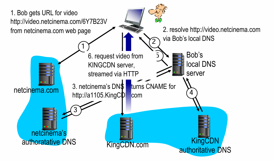 5) Bob은 KingCDN의 콘텐츠 서버를 찾아 비디오 요청
