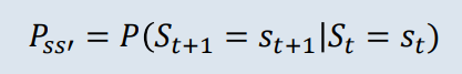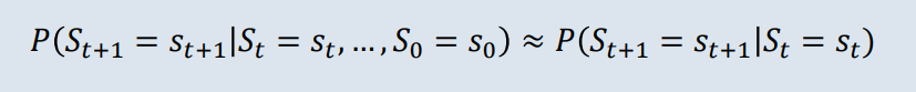 마르코프 과정은 상태 (현재상태)에서 (미래상태) 로의 (전이확률)을 나타내는 과정이며, 위와 같은 식이 성립한다.