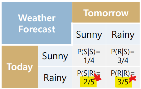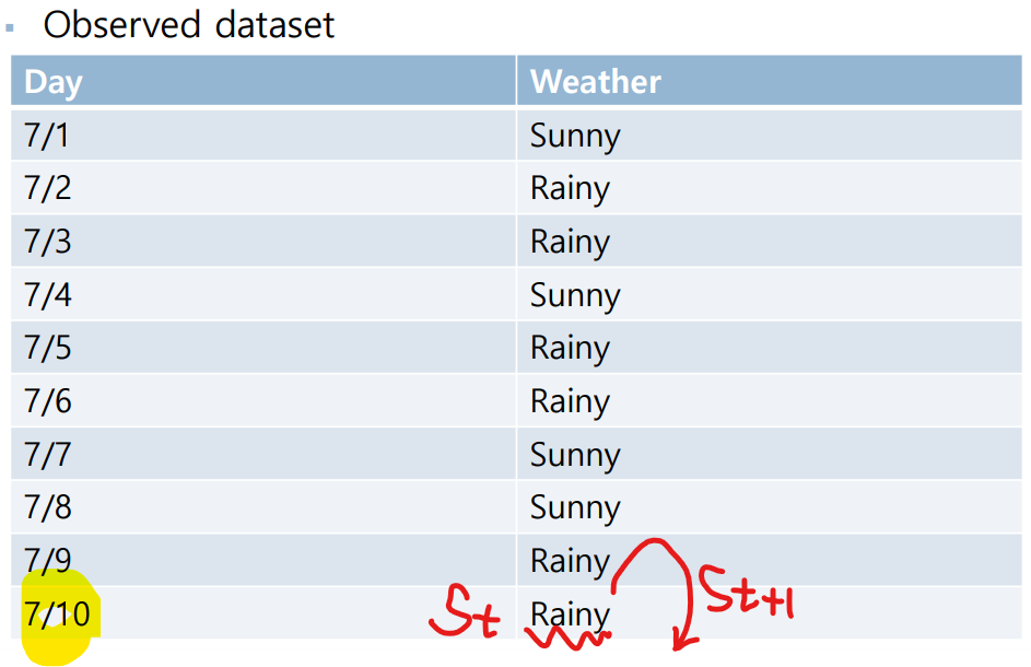 하지만 7/10의 데이터를 살펴보면 (현재상태) : Rainy 는 찾을 수 있지만 (미래상태)의 Dataset이 없다.