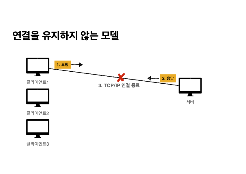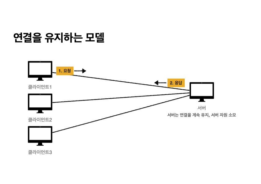이처럼 TCP/IP로 연결을 유지하면, 클라이언트 1이 통신을 주고 받는 동안 클라이언트 2와 클라이언트 3은 대기 상태에 있게 되어 자원이 낭비된다.