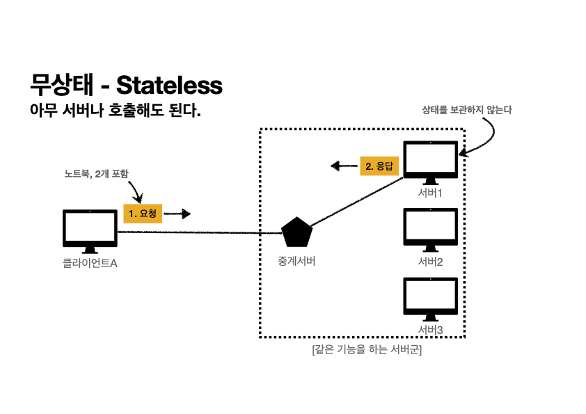 반면, Stateless의 경우에는 점원이 바뀌어도 고객이 필요한 정보를 모두 전달하면 새로운 점원이 문제 없이 다음 행동을 수행할 수 있다.