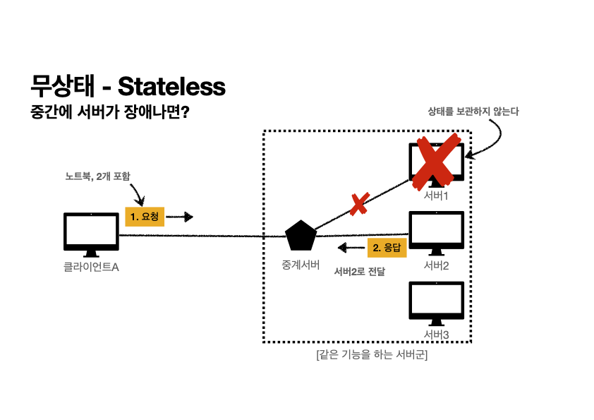 사진과 같이 Stateless 의 경우, 통신 간 서버 장애가 발생했을 때 다른 서버로 전달을 하면 될 뿐이고 고객은 해당 장애를 인지하지 못한다. 즉, 고가용성이 보장된다는 것이다.
