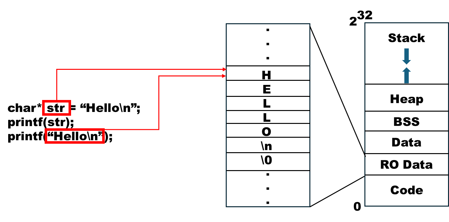 - String literal such as *char** is a pointer to an array of characters within read-only memory