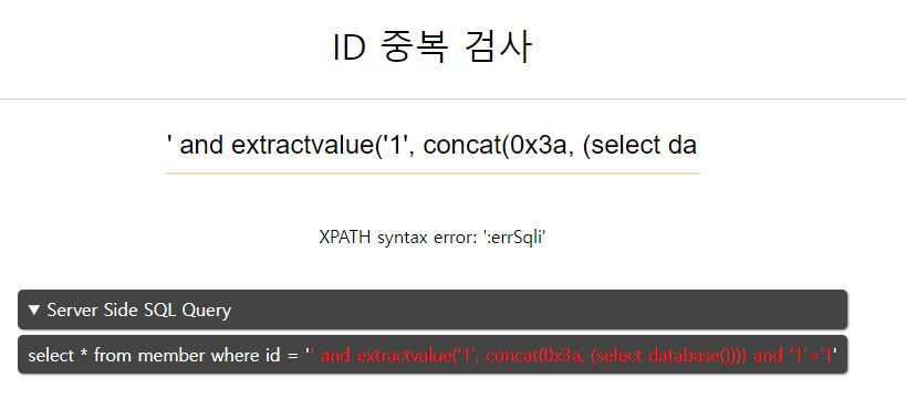 이렇게 문법 오류가 나오는 경우에 extractvalue() 함수를 통한 XPath 오류로 SQLI를 사용할 수 있습니다. extractvalue([xml값], [xpath 표현식])의 형태로 사용되는데, xml값에서 xpath표현식에 해당하는 데이터를 추출하는 함수입니다. 그런데 이 때 xpath 표현식이 잘못된 경우에 xpath 에러가 나오는데 중요한 부분은 이 xpath 에러 부분에 해당하는 sql쿼리는 적힌 그대로 반환하는 것이 아니라 실행한 결과값으로 반환한다는 것입니다.
