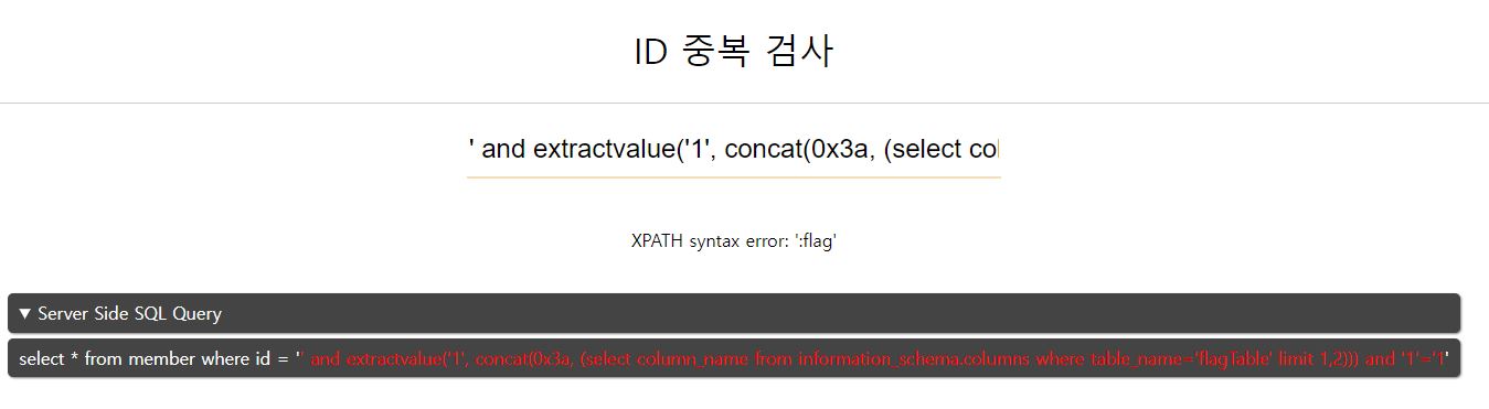 xpath 에러를 기반으로 하는 Error Based SQLI는 ' and exractvalue('1', concat(0x3a,([SQL문]))) and '1'='1 형태로 사용 가능합니다. 해당 사이트에서는 ID를 중복검사하기 위해 ID를 검색하는 SQL문이 있고, 우리가 넣는 부분은 앞 뒤로 '로 감싸여 있을테니 먼저 '를 써서 앞 '부분을 닫고, exractvalue()를 사용하기 위해 and문으로 감싸줍니다. 그 후 extractvalue()함수에 xml값 부분에는 어떤 값이 와도 상관없으니 그냥 1을 넣어주고, concat()함수로 :과 select문을 이어주면 완성입니다. 이번 테스트 사이트에서는 아무 정보 없이 그냥 flag를 찾아야합니다. 그러니 모든 데이터베이스와 테이블을 뒤져봐야겠군요.