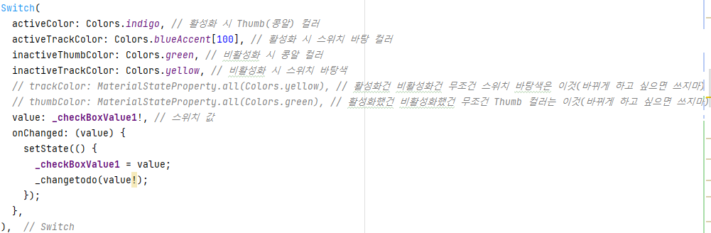 // thumbColor: MaterialStateProperty.all(Colors.green), // 활성화했건 비활성화했건 무조건 Thumb 컬러는 이것(바뀌게 하고 싶으면 쓰지마)