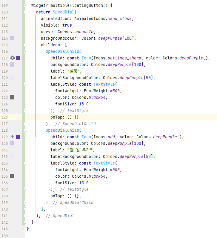 | 원래 보통 플로팅버튼이 이렇게 생겼다면 | Widget?라는 밑의 저게 멀티플 어쩌구 구현한 것 |
