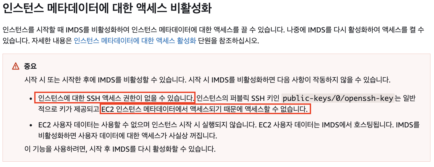 - 기본적으로 ec2의 public ssh key가 제공되는데, 이는 메타데이터에서 액세스가 된다. 근데 내가 메타데이터 액세스를 못하도록 비활성화시켜놔서 ssh permission denied 됐던 것.....