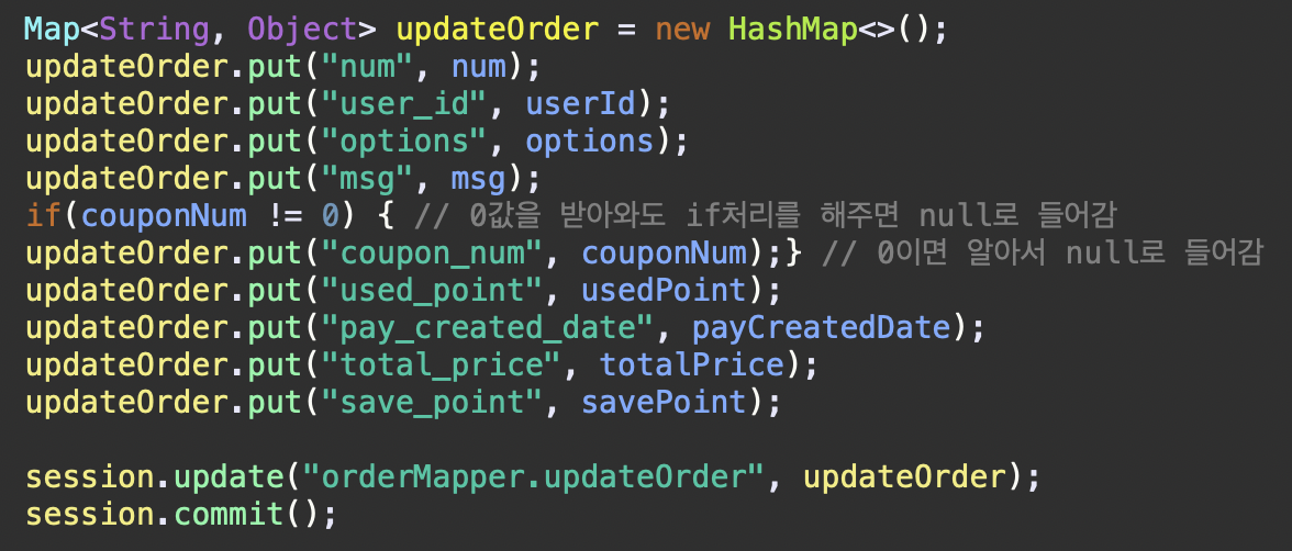 coupon_num이 fk로 존재했기 때문에 0으로 값을 넣어주면 무결성 위배가 계속 떴음.