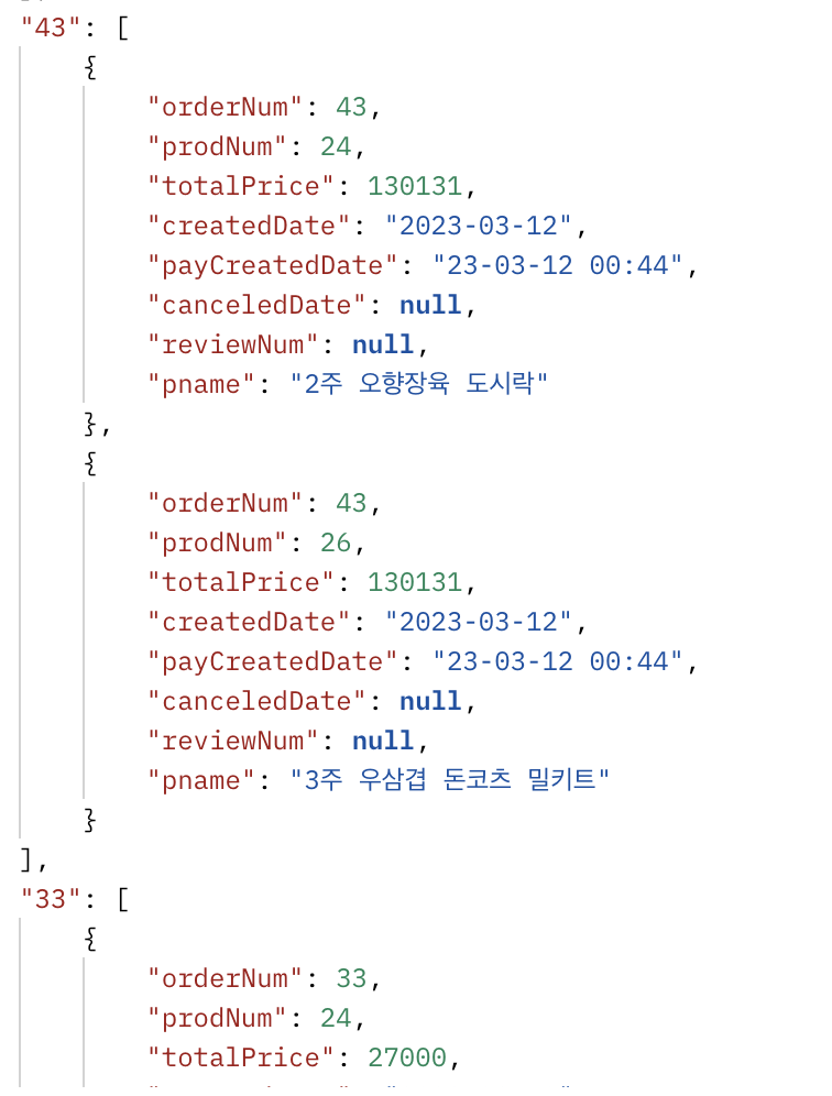 ⬇︎⬇︎ 아래는 해결 후 원하던 json 형식 66, 65번은 orderNum이다.