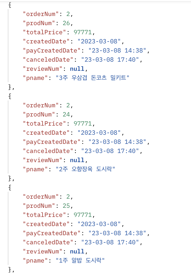 2번 주문번호에 해당하는 주문상세가 3개였다면 3개의{}개로 나눠져서 json이 나타났음