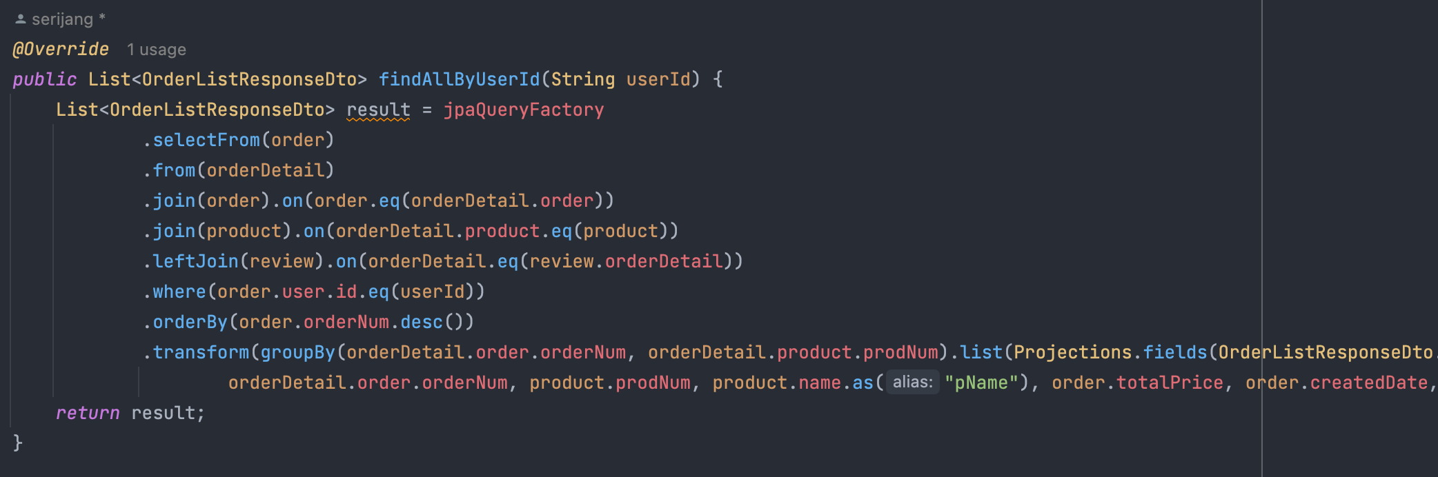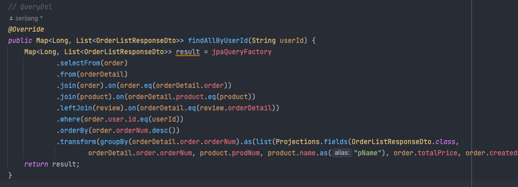 Map<Long, List< Dto>>로, map은 key값이 중복되면 안되지만, orderNum은 unique한 PK이므로 중복될 일 없고,