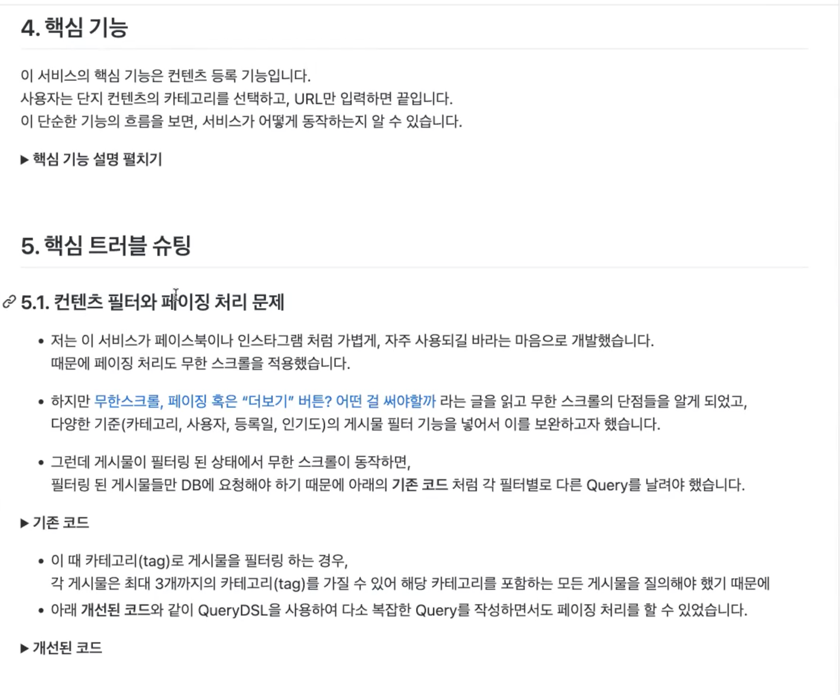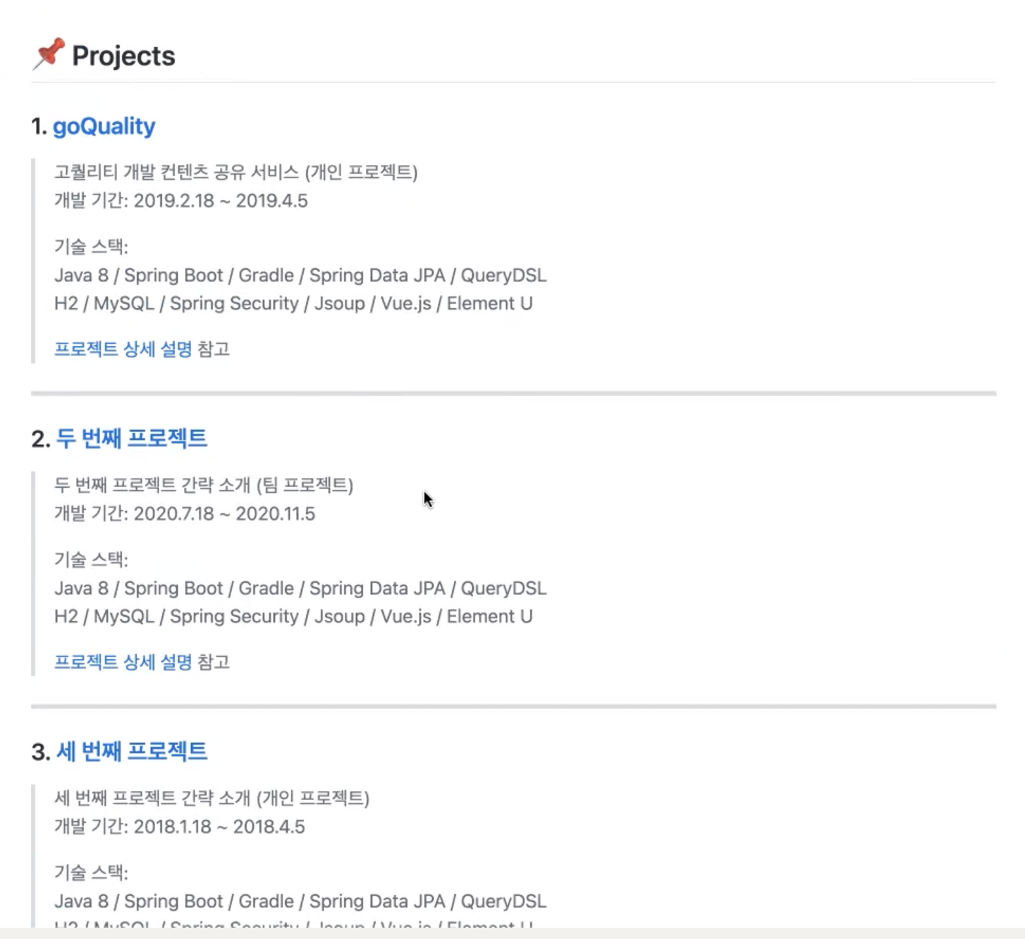 - 중요한 것은 프로젝트의 상세설명을 여기다가 다 작성하지 않는 것. 너무 많으면 정신없고 구별도 안됨. 한눈에 안들어오기때문에 첫 페이지에서는 가장 먼저확인하는 내용(어떤서비스, 개인프로젝트인지 팀인지, 프로젝트 제목이나 링크(동작하는 데모링크), 개발기간은 어느정도, 팀프로젝트라면 본인의 역할, 기술스택도 최대한 중요한 것들 위주로 (언어, 프레임워크, db관련 기술, 기술 스택 버전필수 → 관련해서 면접질문 많이 들어올 것이기 때문에 버전명시를 해줘야 예상못한 질문 들어오는 것 방지)