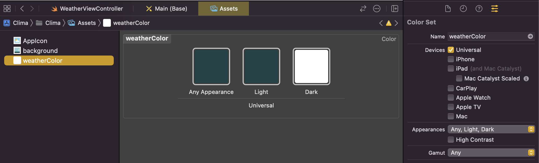 Assets에서 원하는 Custom Color를 설정한다. Appearance를 Any, White, Dark로 설정하면 상황에 맞는 색깔을 선택할 수 있다.