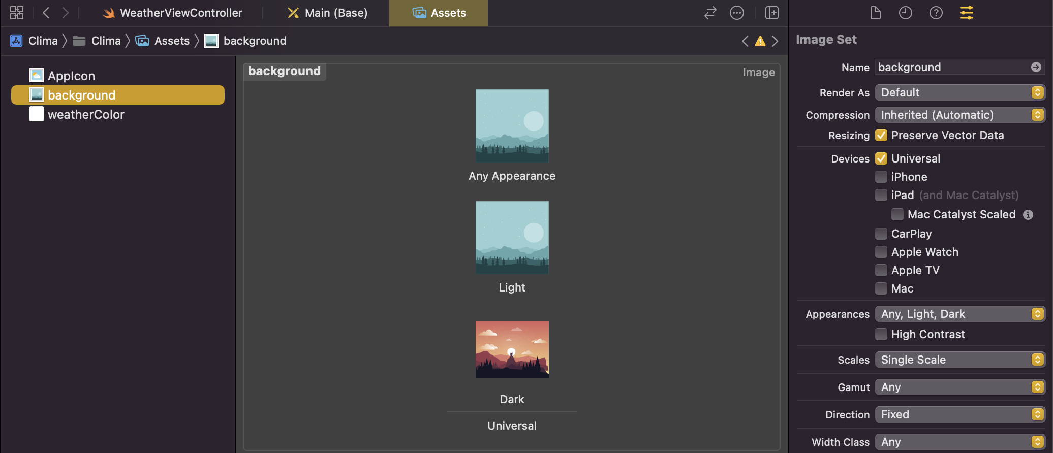 배경 또한 상황에 맞게 설정해준다. 원래 png로 설정하면 1x, 2x, 3x 별로 다른 사진을 설정하여 픽셀이 깨지는 것을 방지해야하지만 pdf파일로 설정하면 다음과 같이 벡터가 깨지지 않도록 Resizing을 선택해줄 수 있다.