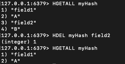 - HDEL key field: 입력한 해시 키 밑에 필드를 삭제