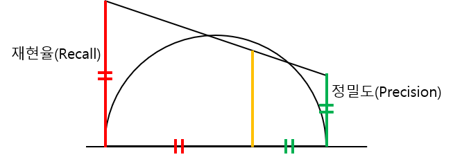 (재현율과 정밀도 값이, 지름(재현율+정밀도)를 공유하고 있습니다.)