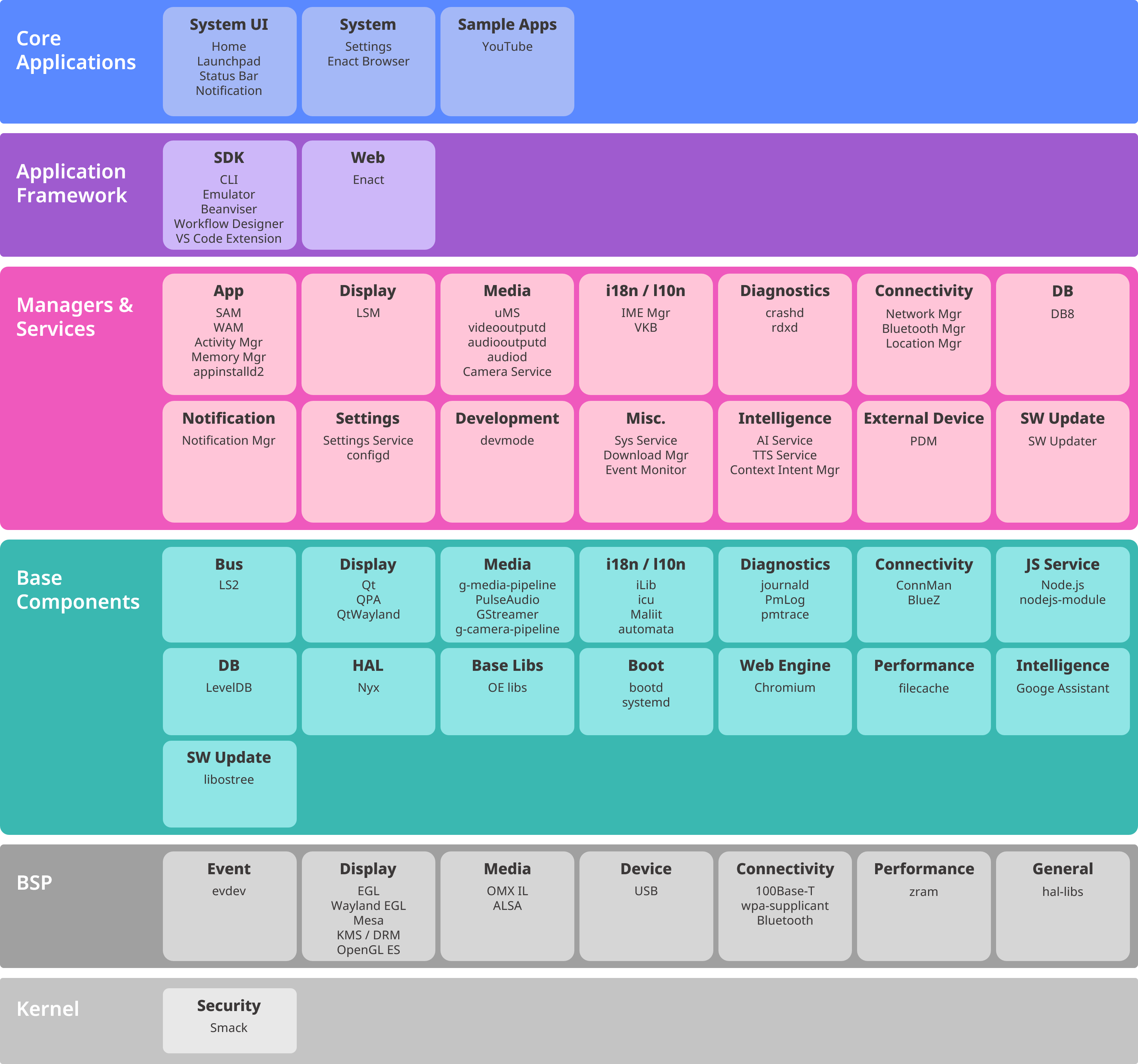 Base Components : 운영체제의 핵심적인 구성요소들이 포함됩니다. 시스템의 기본적인 동작을 지원하는데 여기에는 LS2나 web engine, Nods.js가 포함됩니다.
