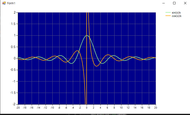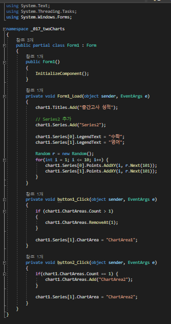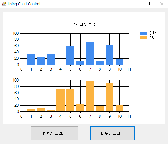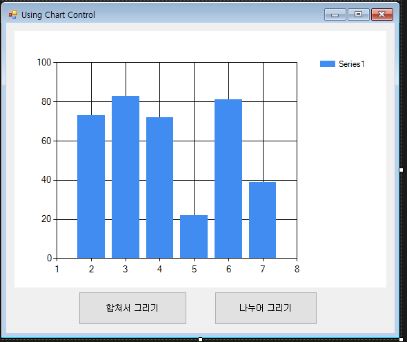 나누어 그리기를 누르면 private void button2_Click(object sender, EventArgs e) 함수가 실행되면서 Series의 ChartArea가 바뀐다.