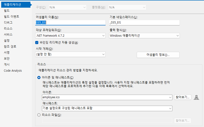 해당 프로젝트를 우클릭 하여 속성 탭에 들어가면 아이콘을 바꿀 수 있는 탭을 확인할 수 있다.