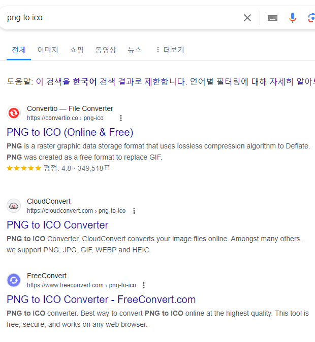 .png 사진 파일을 .ico 아이콘 확장자로 변경하려면 구글에 png to ico를 검색하여 원하는 사이트에 접속해서 확장자를 변경할 수 있다.