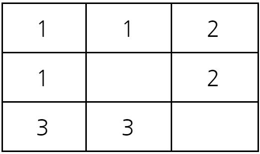 예를 들어 다음과 같이 3x3 크기의 시험관이 있다고 하자. 서로 다른 1번, 2번, 3번 바이러스가 각각 (1,1), (1,3), (3,1)에 위치해 있다. 이 때 2초가 지난 뒤에 (3,2)에 존재하는 바이러스의 종류를 계산해보자.