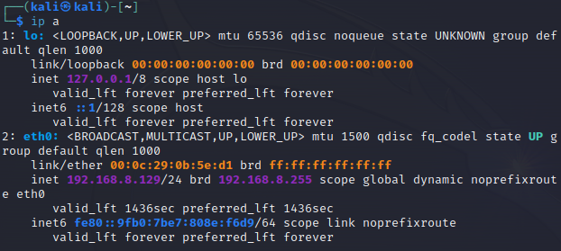 ip 주소는 eth0(이더넷) 192.168.8.129 인것을 확인.