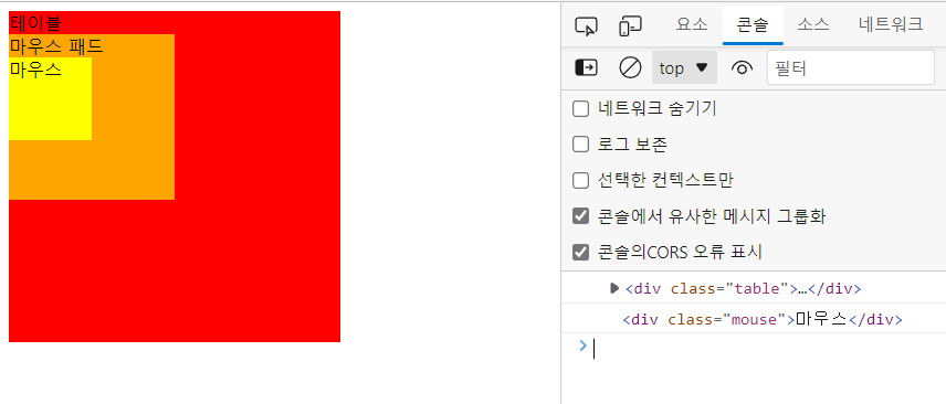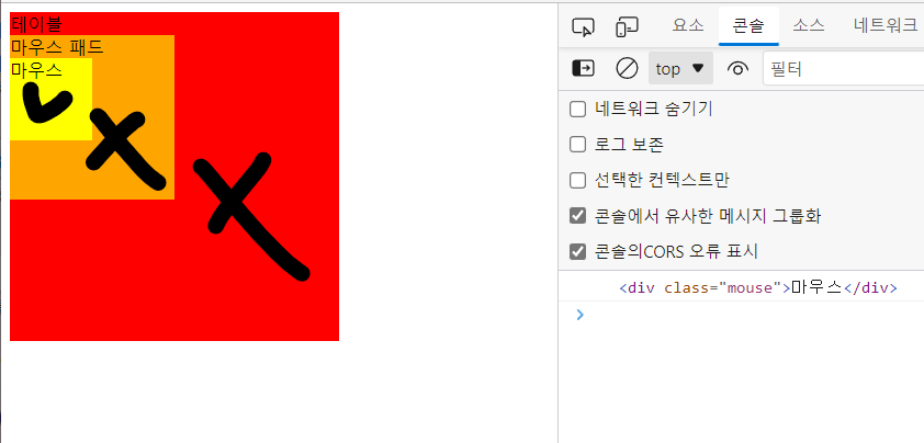 결론적으로 콘솔에는 마우스 요소에 target메시지만 찍히게 되었습니다.