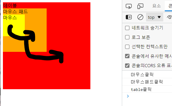 정답:브라우저는 하위요소(마우스)를 클릭해도 상위요소(책상)까지 누른걸