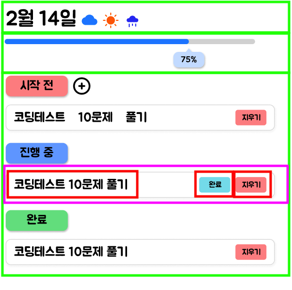 또한 핑크색 박스를 부모 컴포넌트, 빨간색 박스를 자식컴포넌트로 다시 합성컴포넌트를 이용해 분리해줬다. 이유는 위에는 지우기버튼만 있고 다른 곳은 완료, 지우기 버튼을 가지고 있다. 추가로 다른 버튼이 생길 수 있다고 생각했기 때문에 유연하게 상황을 대처하기위해서 합성컴포넌트를 이용했다.