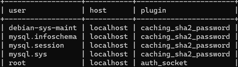 SELECT user,host,plugin from mysql.user;