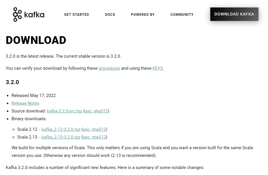 아파치 카프카는 아파치 공식 홈페이지 kafka 설치에서 원하는 버전을 다운로드 하면 설치가 가능합니다. 간혹 Windows 환경에서 Kafka를 설치하면 Windows의 파일 시스템과 잘 연동이 되지 않음으로 버전을 다운그레이드하는 것을 추천드립니다.