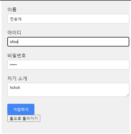 타임리프를 사용해서 joinPage를 구성했다. Front적인 부분은 내가 미적감각이 없고 많이 해보지 않아서 그냥 기능만 하도록 만들었다.