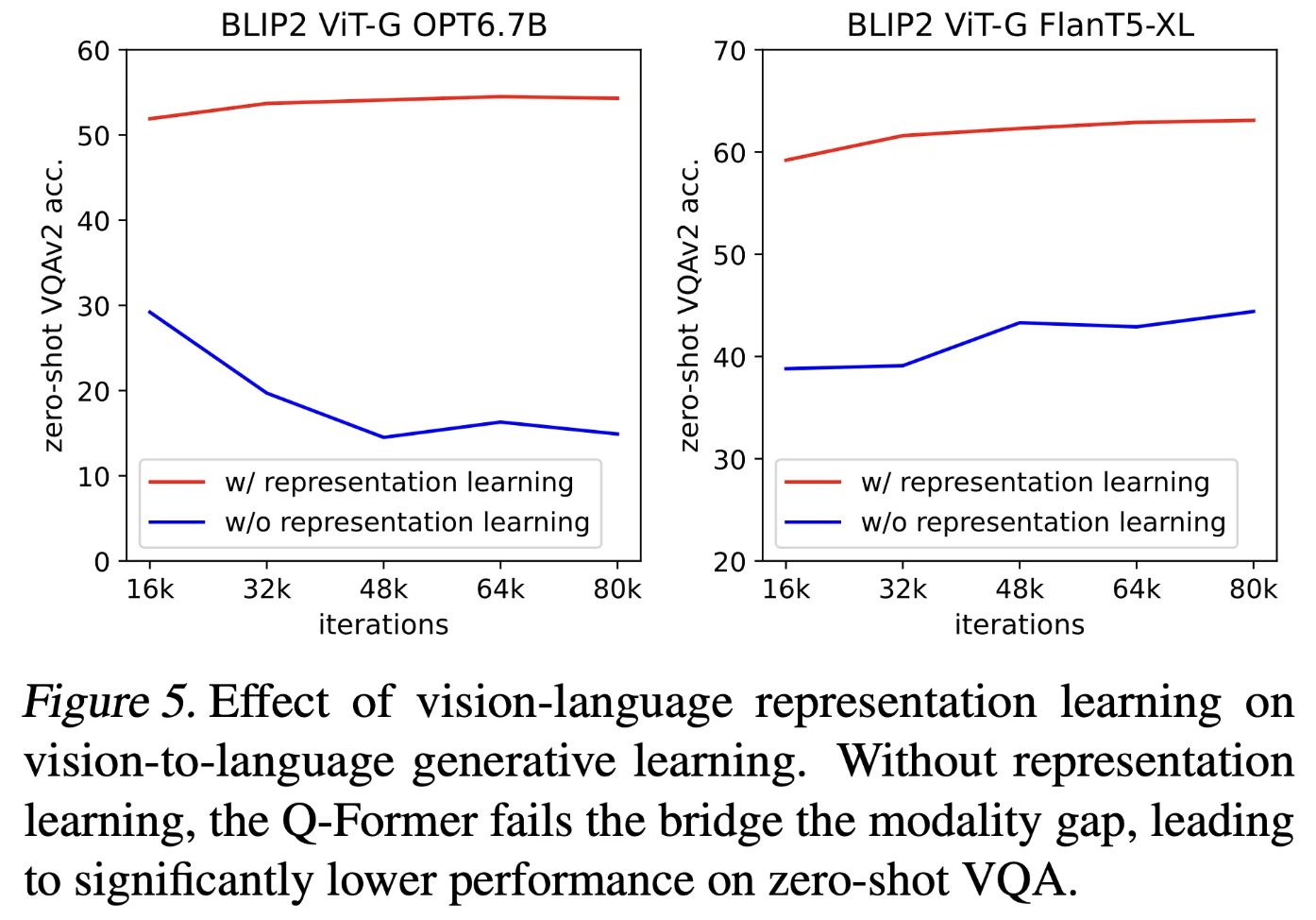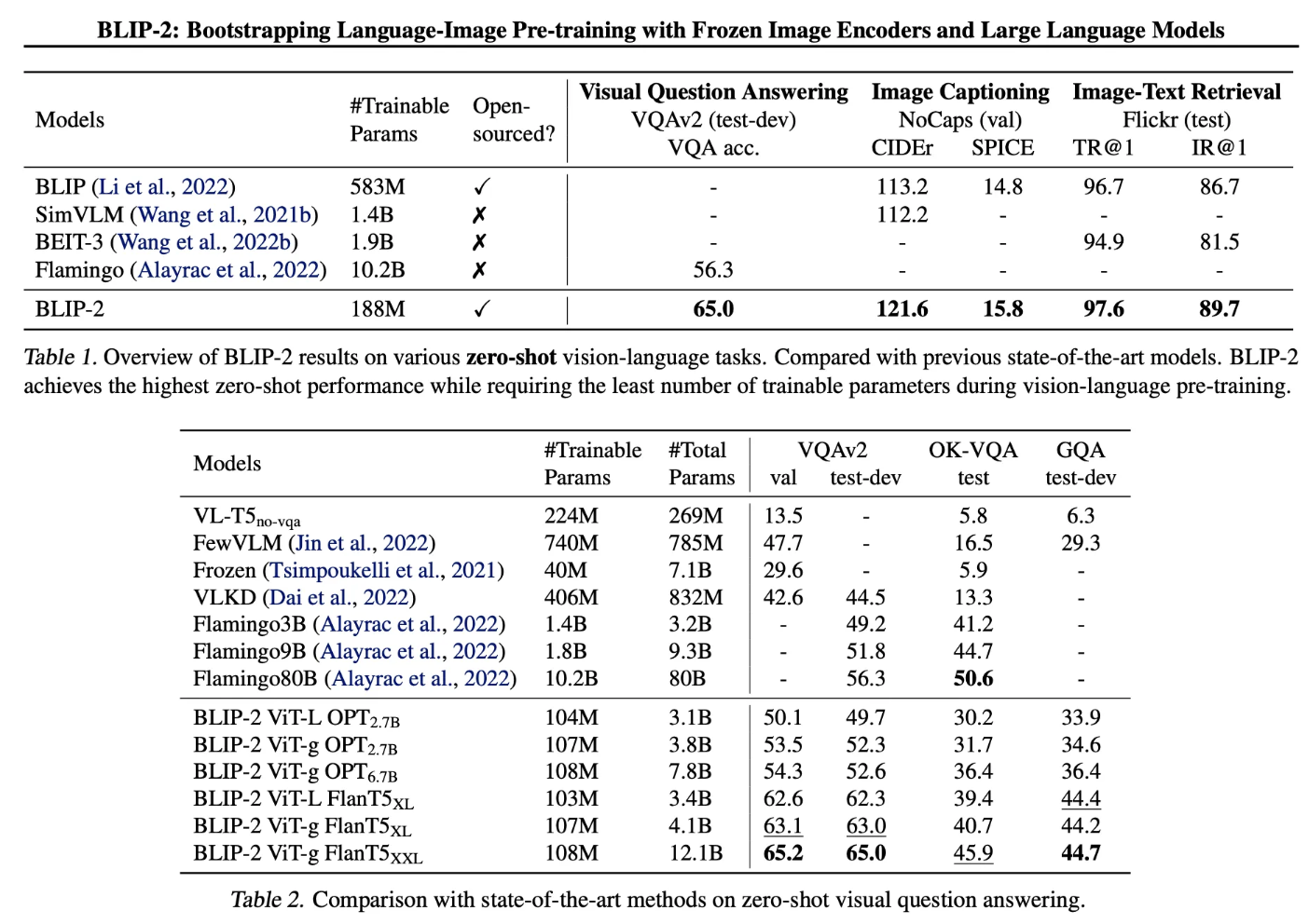 Pre-trained Image Enocder와 Pre-trained LLM의 추가 학습없이, 적은 파라미터를 갖는 Q-Former만을 학습하여 거대 이미지 모델과 거대 언어 모델의 표현력의 차이를 줄여 보다 VQA에서 SOTA급 성능을 보여줄 수 있다고 주장합니다.