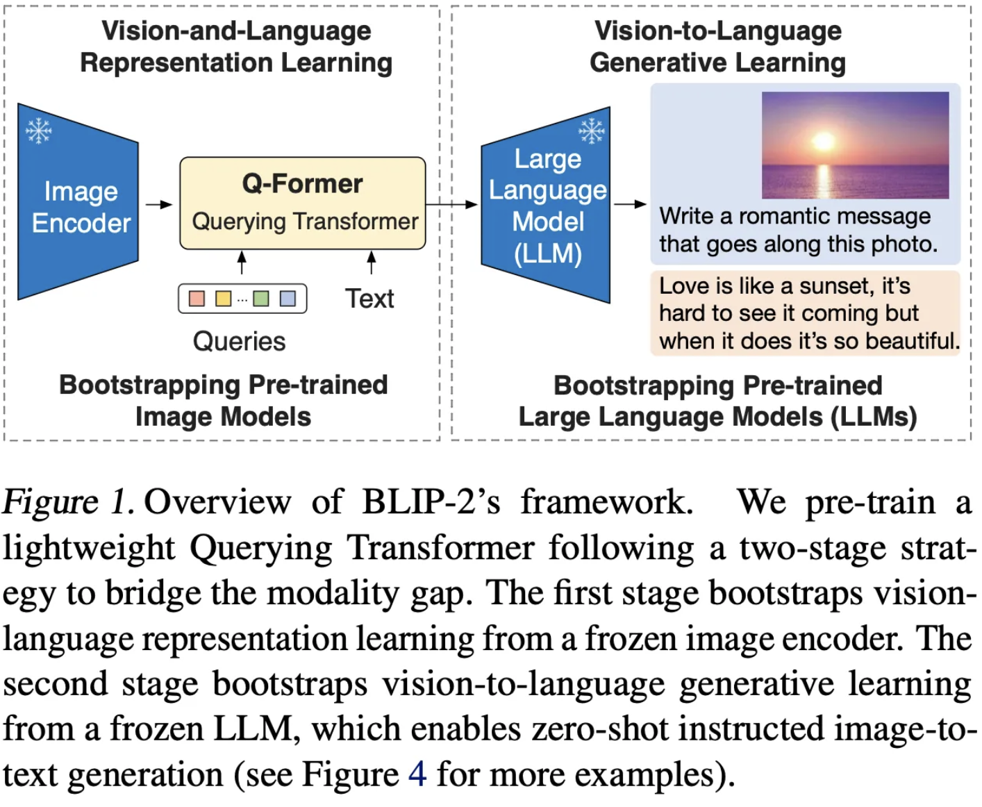 본 논문에서는 BLIP-2라는 Unimodal ( 각 독립된 모달리티로 학습된 모델 ) 을 Q-Former라는 다리역할을 수 행하는 모델로 두 모달리이 사이의 차이를 줄이도록 2단계를 걸처 학습하게 됩니다.