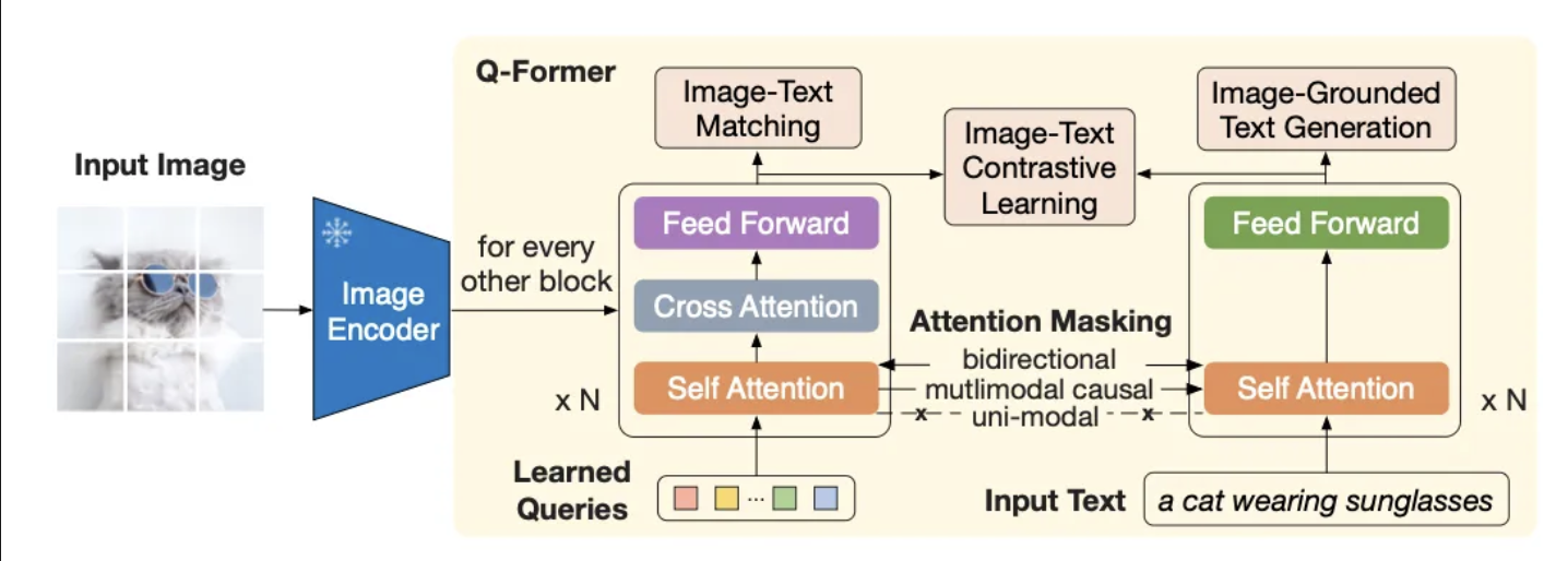 ITC, ITG, ITM 3가지 테스크로 Q-Former를 학습 시킴으로써 Q-Former가 텍스트에서 중요한 이미지 특징을 추출하는 방법을 학습할수 있게됩니다.