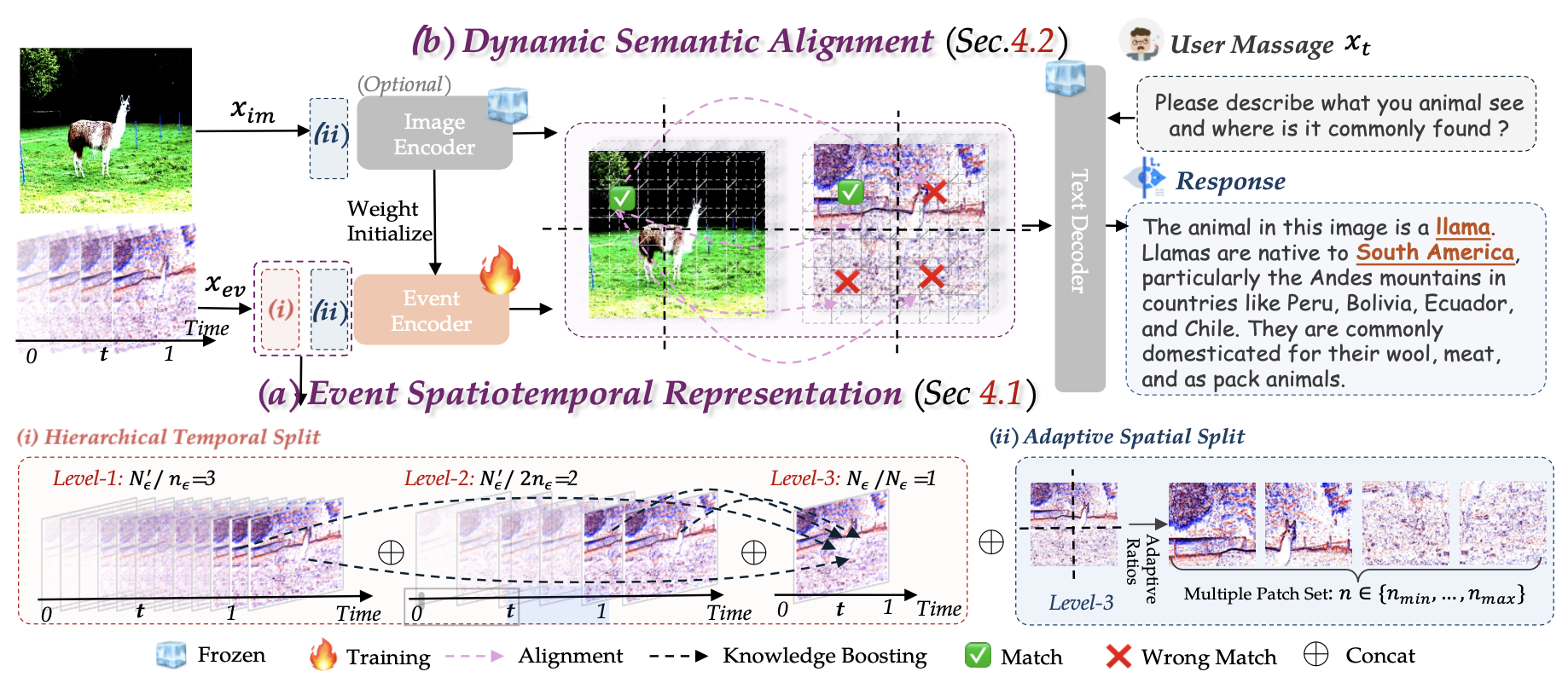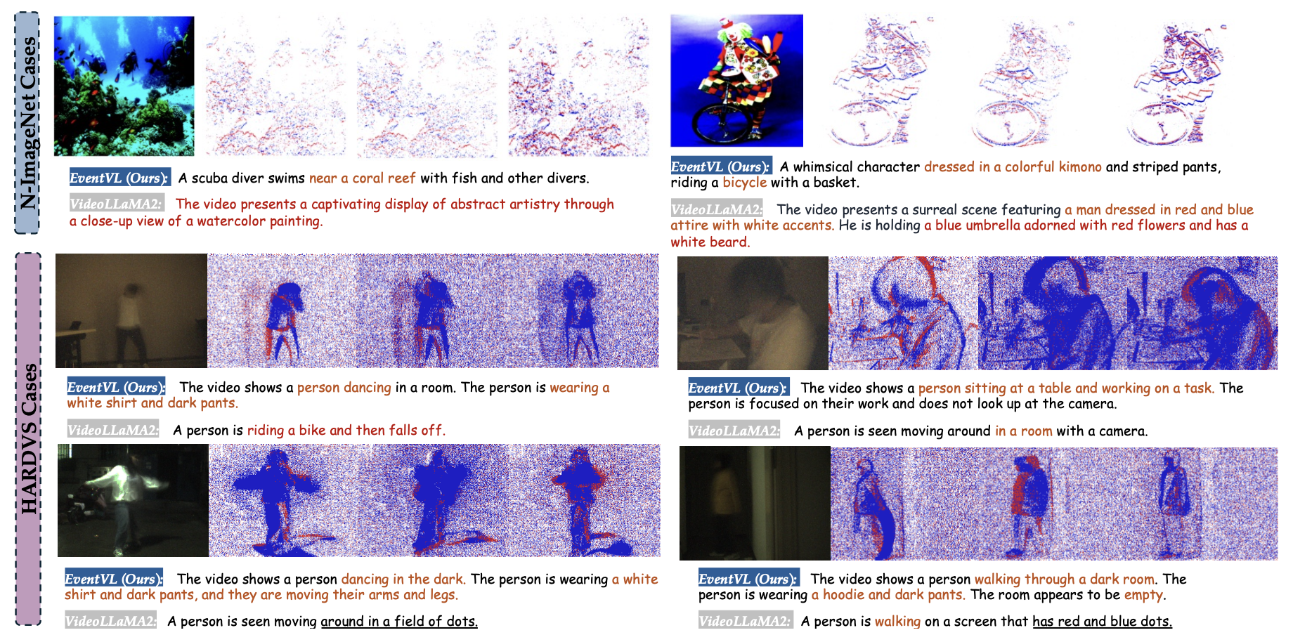본 논문에서는 기존 데이터셋의 Caoption이 단순하게 설정되어 이미지(Event)의 의미론적 정보를 추출하는데 한계가 있다고 판단하여 이미지(Event)에서 의미를 추출할 수 있는 새로운 데이터셋을 구축하였습니다. 추가로 이벤트 데이터의 의미적 정보까지 추출 할 수 있는 Event Spatiotemporal Representation 을 제안하였습니다. 그리고 Event 데이터와 프레임 이미지를 정렬하기 위한 Dynamic Semantic Alignment 모듈을 제안하였습니다.
