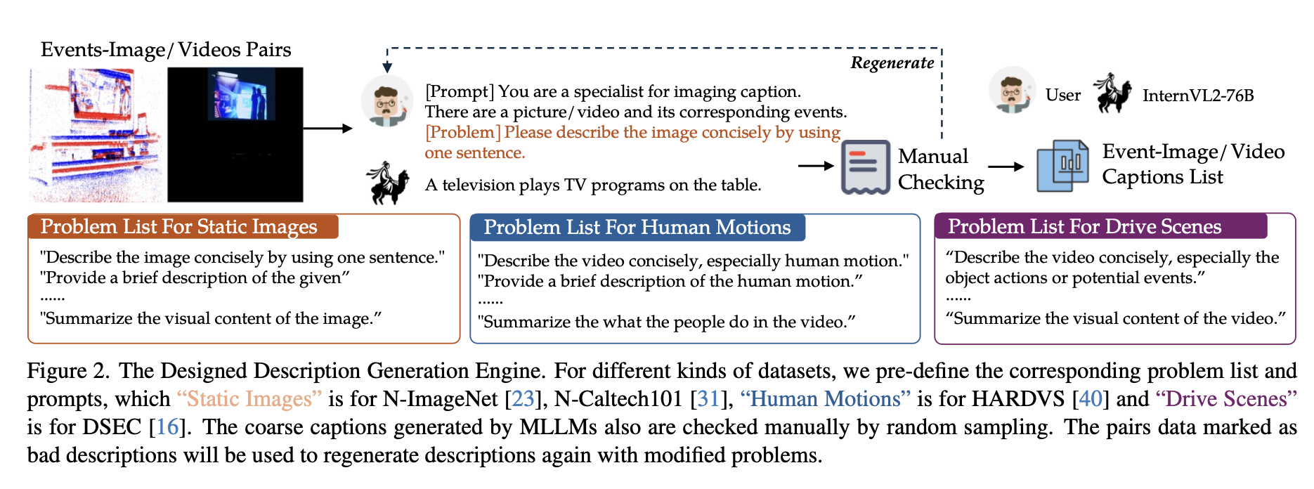 데이터를 생성하기 위해서 N-ImageNet, N-Caltech101, HARDVS, DSEC 데이터를 가져왔습니다. 그리고 사전에 질문 리스트들을 생성하였고, 랜덤으로 질문을 가져와서 ( 이미지 ( 비디오 ) , 질문 ) 을 하나의 쌍으로 만들었습니다ㅣ. 그리고 이렇게 만들어진 쌍을 open source에서 높은 성능을 낸다고 알려진 InternVL2-76 모델에 넣어서 Caption을 생성하도록 하였습니다. HARDVS, DSEC와 같은 비디오 데이터의 경우 특정 길이 만큼의 프레임을 하나의 프레임으로 묶어서 입력으로 활용하였습 니다.