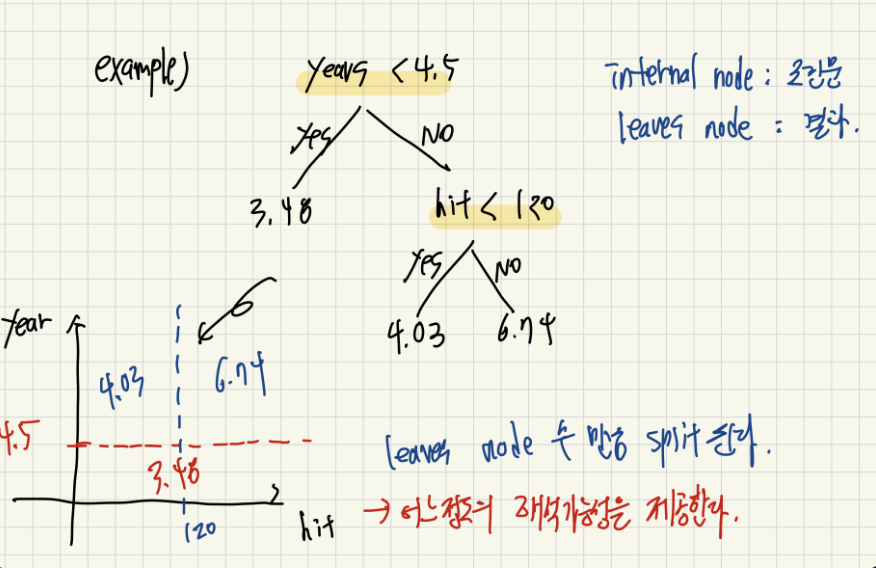Regression Tree의 경우 다음과 같이 leaves node에서 최종적으로 결정할 실수 값을 얻게 됩니다. 그리고 각각의 Node에서는 부등호를 사용해서 데이터들을 2가지 분류로 나눠주게 됩니다.